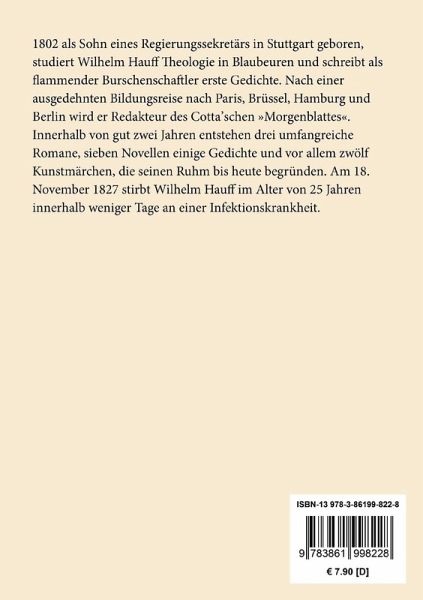 1802 als Sohn eines Regierungssekretärs in Stuttgart geboren, studiert Wilhelm Hauff Theologie in Blaubeuren und schreibt als flammender Burschenschaftler erste Gedichte. Nach einer ausgedehnten Bildungsreise nach Paris, Brüssel, Hamburg und Berlin wird er Redakteur des Cotta'schen "Morgenblattes". Innerhalb von gut zwei Jahren entstehen drei umfangreiche Romane, sieben Novellen einige Gedichte und vor allem zwölf Kunstmärchen, die seinen Ruhm bis heute begründen. Am 18. November 1827 stirbt Wilhelm Hauff im Alter von 25 Jahren innerhalb weniger Tage an einer Infektionskrankheit.