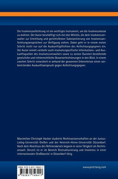 Die Insolvenzanfechtung ist ein wichtiges Instrument, um die Insolvenzmasse zu mehren. Der Autor beschäftigt sich mit den Mitteln, die dem Insolvenzverwalter zur Ermittlung und gerichtsfesten Substantiierung von Insolvenzanfechtungsansprüchen zur Verfügung stehen. Dabei geht er in einem ersten Schritt nicht nur auf die Auskunftspflichten des Anfechtungsgegners ein. Der Autor nimmt vielmehr auch insolvenzspezifische Informations- und Auskunftsquellen des Insolvenzverwalters sowie zu seinen Gunsten bestehende gesetzliche und richterrechtliche Beweiserleichterungen in den Blick. In einem zweiten Schritt entwickelt er anhand der gewonnen Erkenntnisse einen vorbereitenden Auskunftsanspruch gegen Anfechtungsgegner.