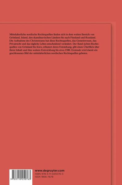 Mittelalterliche nordische Rechtsquellen finden sich in dem weiten Bereich von Grönland, Island, den skandinavischen Ländern bis nach Finnland und Russland. Ihr Inhalt und ihre Entwicklung werden hier erstmals zusammenfassend dargestellt. Die Aufnahme des Christentums hat diese Rechtsquellen, das Gemeinwesen, das Privatrecht und das tägliche Leben entscheidend verändert: Die Könige verstanden sich jetzt als christliche Streiter und beanspruchten ein eigenes Recht zur Gesetzgebung. Im Strafrecht löste die Täterschuld das Erfolgsprinzip ab, und der Spruch der Geschworenen ersetzte die Eisenprobe (iudicium ferri igniti). Die christliche Ehelehre wurde herrschend, die Kirche suchte das sippengebundene Erbrecht zu ihrem Vorteil zu ändern, indem sie Seelgaben und Testamente einführte, und in Schweden verdrängte die Sonnenteilung die gewachsene Form der Dörfer. Der Band zeichnet die Rechtsentwicklung im Norden von der Wikingerzeit an, gibt jeweils eine kurze Übersicht über die Landschaften, erläutert die Überlieferung ihrer Rechtsquellen und folgt ihren Inhalten anhand der politischen Entwicklung bis etwa 1500, als Humanismus und Reformation das überkommene Recht zu verändern begannen. 28 Landkarten dienen der Veranschaulichung des Gesagten.