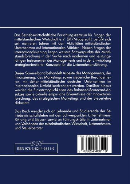 Das Betriebswirtschaftliche Forschungszentrum für Fragen der mittelständischen Wirtschaft e. V. (BF/M-Bayreuth) befaßt sich seit mehreren Jahren mit den Aktivitäten mittelständischer Unternehmen auf internationalen Märkten. Neben Fragen der Internationalisierung liegen weitere Schwerpunkte der Mittelstandsforschung in der Suche nach modernen und leistungsfähigen Instrumenten des Managements und in der Entwicklung strategieorientierter Konzepte für die Unternehmensführung. Dieser Sammelband behandelt Aspekte des Managements, der Finanzierung, des Marketings sowie steuerliche Besonderheiten, mit denen mittelständische deutsche Unternehmen im internationalen Umfeld konfrontiert werden. Darüber hinaus werden die Einsatzmöglichkeiten des Balanced-Scorecard-Ansatzes sowie aktuelle empirische Erkenntnisse der Innovationsforschung, des strategischen Marketings und der Steuerlehre diskutiert.