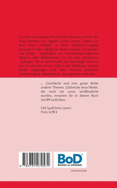 In seiner zwanzigsten Buchveröffentlichung möchte der Autor Norbert van Tiggelen seinen Lesern -mitten aus dem Leben- erzählen. In dieser Jubiläums-Ausgabe berichtet er über alltägliche Vorkommnisse, Situationen und Dinge - angefangen von multitasking-tauglichen Müttern über Kaffeefahrten bis hin zum würdelosen -Erzeuger-, der es nicht schafft, ein aufrichtiger Vater zu sein. Er schreibt von der Stille in der Wohnung, weil die Kinder ausgezogen sind, über Demenz, plötzliche Arbeitslosigkeit, Alkoholsucht, das angeblich schwache Geschlecht und eine ganze Reihe anderer Themen. Zahlreiche neue Werke, die noch nie zuvor veröffentlicht wurden, erwarten Sie in diesem Buch mit 89 Gedichten. Viel Spaß beim Lesen!