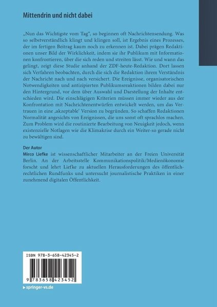 " ... "Mittendrin und nicht dabei" ist ein gelungenes Beispiel für eine fundierte und praxisnahe Dissertation, die einen wertvollen Beitrag zur Erforschung journalistischer Praktiken leistet. Mit seiner klaren Fragestellung, theoretischen Tiefe und methodischen Stringenz setzt Mirco Liefke Maßstäbe für zukünftige Untersuchungen im Bereich der Medienethnografie. Wer sich für die inneren Abläufe und ethischen Herausforderungen des Nachrichtenjournalismus interessiert, findet in diesem Buch eine wertvolle und inspirierende Quelle." (Dr. Tong-Jin Smith, in: Publizistik, Jg. 69, Heft 4, 2024)