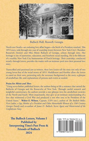 North met South-an enduring love affair began-the birth of a President resulted. This 1853 story, told through one year of courtship letters between New York City's Theodore Roosevelt (Senior) and Miss Mittie Bulloch of Georgia, echoes through time. Her heritage is one of patriotism, education, and Southern social standing. He is the fifth son of a wealthy New York City businessman of Dutch heritage. Their courtship, conducted mostly through letters, provides the reader with an intimate peek into their personal love story. Transcribed and presented just as written, these love letters tell the story not only of two young lovers but of the social mores of 1853. Huddleston and Koehler allow the letters to stand on their own, presenting only the necessary background to the story, a glimpse of antebellum life, and explanations of persons and events as needed. This is the first in a series of three books of transcribed letters between the Georgia's Bulloch women and members of the Roosevelt family from 1853 until the end of the Civil War.