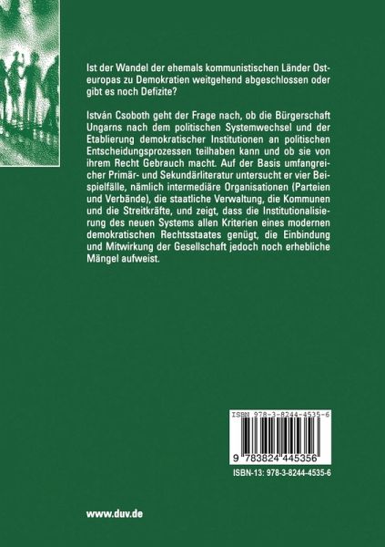 István Csoboth geht der Frage nach, ob die Bürgerschaft Ungarns nach dem politischen Systemwechsel und der Etablierung demokratischer Institutionen an politischen Entscheidungsprozessen teilhaben kann und ob sie von ihrem Recht Gebrauch macht. Auf der Basis umfangreicher Primär- und Sekundärliteratur untersucht er vier Beispielfälle, nämlich intermediäre Organisationen (Parteien und Verbänden), die staatliche Verwaltung, die Kommunen und die Streitkräfte, und zeigt, dass die Institutionalisierung des neuen Systems allen Kriterien eines modernen demokratischen Rechtsstaates genügt, die Einbindung und Mitwirkung der Gesellschaft jedoch noch erhebliche Mängel aufweist.