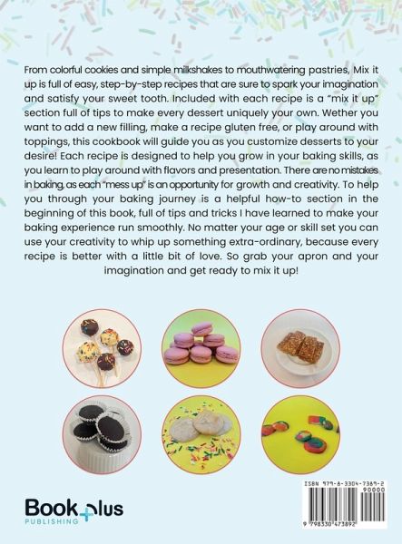 From colorful cookies and simple milkshakes to mouthwatering pastries, Mix it Up is full of easy, step-by-step recipes that are sure to spark your imagination and satisfy your sweet tooth. Included with each recipe is a "mix it up" section full of tips to make every dessert uniquely your own. Whether you want to add a new filling, make a recipe gluten-free, or play around with toppings, this cookbook will guide you as you customize desserts to your desire! Each recipe is designed to help you grow in your baking skills as you learn to play around with flavors and presentation. There are no mistakes in baking, as each "mess up" is an opportunity for growth and creativity. To help you through your baking journey is a helpful how-to section in the beginning of this book, full of tips and tricks I have learned to make your baking experience run smoothly. No matter your age or skill set, you can use your creativity to whip up something extraordinary because every recipe is better with a little bit of love. So grab your apron and your imagination and get ready to mix it up!