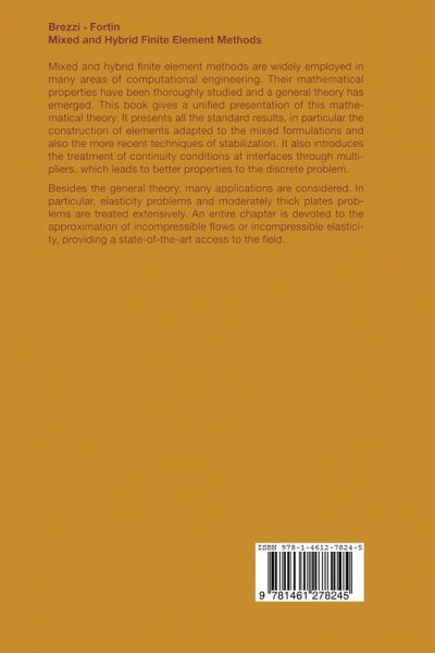 I: Variational Formulations and Finite Element Methods.- 1. Classical Methods.- 2. Model Problems and Elementary Properties of Some Functional Spaces.- 3. Duality Methods.- 4. Domain Decomposition Methods, Hybrid Methods.- 5. Augmented Variational Formulations.- 6. Transposition Methods.- 7. Bibliographical remarks.- II: Approximation of Saddle Point Problems.- 1. Existence and Uniqueness of Solutions.- 2. Approximation of the Problem.- 3. Numerical Properties of the Discrete Problem.- 4. Solution by Penalty Methods, Convergence of Regularized Problems.- 5. Iterative Solution Methods. Uzawa's Algorithm.- 6. Concluding Remarks.- III: Function Spaces and Finite Element Approximations.- 1. Properties of the spaces Hs(?) and H(div; ?).- 2. Finite Element Approximations of H1(?) and H2(?).- 3. Approximations of H (div; ?).- 4. Concluding Remarks.- IV: Various Examples.- 1. Nonstandard Methods for Dirichlet's Problem.- 2. Stokes Problem.- 3. Elasticity Problems.- 4. A Mixed Fourth-Order Problem.- 5. Dual Hybrid Methods for Plate Bending Problems.- V: Complements on Mixed Methods for Elliptic Problems.- 1. Numerical Solutions.- 2. A Brief Analysis of the Computational Effort.- 3. Error Analysis for the Multiplier.- 4. Error Estimates in Other Norms.- 5. Application to an Equation Arising from Semiconductor Theory.- 6. How Things Can Go Wrong.- 7. Augmented Formulations.- VI: Incompressible Materials and Flow Problems.- 1. Introduction.- 2. The Stokes Problem as a Mixed Problem.- 3. Examples of Elements for Incompressible Materials.- 4. Standard Techniques of Proof for the inf-sup Condition.- 5. Macroelement Techniques and Spurious Pressure Modes.- 6. An Alternative Technique of Proof and Generalized Taylor-Hood Element.- 7. Nearly Incompressible Elasticity, Reduced Integration Methods and Relation with Penalty Methods.- 8. Divergence-Free Basis, Discrete Stream Functions.- 9. Other Mixed and Hybrid Methods for Incompressible Flows.- VII: Other Applications.- 1. Mixed Methods for Linear Thin Plates.- 2. Mixed Methods for Linear Elasticity Problems.- 3. Moderately Thick Plates.- References.