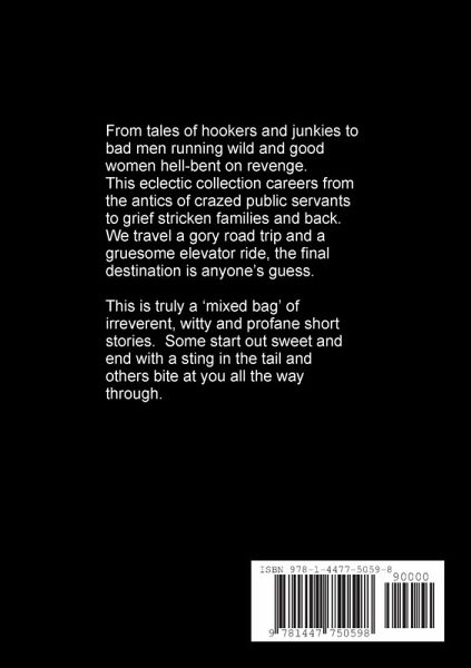 From tales of hookers and junkies to bad men running wild and good women hell-bent on revenge. This eclectic collection careers from the antics of crazed public servants to grief stricken families and back. We travel a gory road trip and a gruesome elevator ride, the final destination is anyone's guess. This is truly a 'mixed bag' of irreverent, witty and profane short stories. Some start out sweet and end with a sting in the tail and others bite at you all the way through. The stories and characters are fictional and any resemblance to real people is strictly intentional. Anyone who is offended probably remembers their part all too well!