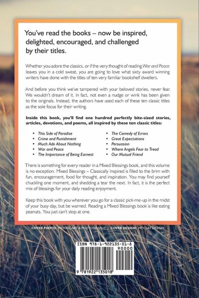 You've read the books-now be inspired, delighted, encouraged, and challenged by their titles. Whether you adore the classics, or if the very thought of reading War and Peace leaves you in a cold sweat, you are going to love what sixty award winning writers have done with the titles of ten very familiar bookshelf dwellers. And before you think we've tampered with your beloved stories, never fear. We wouldn't dream of it. In fact, not even a nudge or wink has been given to the originals. Instead, the authors have used each of these ten classic titles as the sole focus for their writing. Inside this book, you'll find one hundred perfectly bite-sized stories, articles, devotions, and poems, all inspired by these ten classic titles: • This Side of Paradise • Crime and Punishment • Much Ado About Nothing • War and Peace • The Importance of Being Earnest • The Comedy of Errors • Great Expectations • Persuasion • Where Angels Fear to Tread • Our Mutual Friend There is something for every reader in a Mixed Blessings book, and this volume is no exception. Mixed Blessings-Classically Inspired is filled to the brim with fun, encouragement, food for thought, and inspiration. You may find yourself chuckling one moment, and shedding a tear the next. In fact, it is the perfect mix of blessings for your daily reading enjoyment. Keep this book with you wherever you go for a classic pick-me-up in the midst of your busy day, but be warned. Reading a Mixed Blessings book is like eating peanuts. You just can't stop at one.