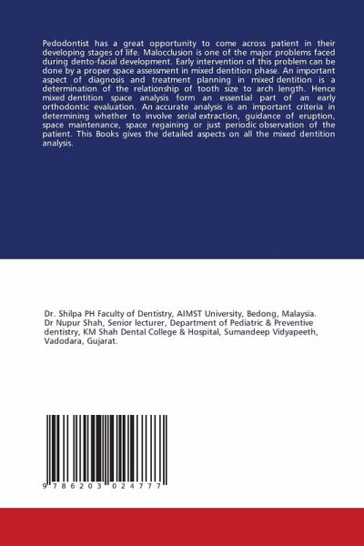 Pedodontist has a great opportunity to come across patient in their developing stages of life. Malocclusion is one of the major problems faced during dento-facial development. Early intervention of this problem can be done by a proper space assessment in mixed dentition phase. An important aspect of diagnosis and treatment planning in mixed dentition is a determination of the relationship of tooth size to arch length. Hence mixed dentition space analysis form an essential part of an early orthodontic evaluation. An accurate analysis is an important criteria in determining whether to involve serial extraction, guidance of eruption, space maintenance, space regaining or just periodic observation of the patient. This Books gives the detailed aspects on all the mixed dentition analysis.