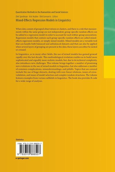 When data consist of grouped observations or clusters, and there is a risk that measurements within the same group are not independent, group-specific random effects can be added to a regression model in order to account for such within-group associations. Regression models that contain such group-specific random effects are called mixed-effects regression models, or simply mixed models. Mixed models are a versatile tool that can handle both balanced and unbalanced datasets and that can also be applied when several layers of grouping are present in the data; these layers can either be nested or crossed. In linguistics, as in many other fields, the use of mixed models has gained ground rapidly over the last decade. This methodological evolution enables us to build more sophisticated and arguably more realistic models, but, due to its technical complexity, also introduces new challenges. This volume brings together a number of promising new evolutions in the use of mixed models in linguistics, but also addresses a number of common complications, misunderstandings, and pitfalls. Topics that are covered include the use of huge datasets, dealing with non-linear relations, issues of cross-validation, and issues of model selection and complex random structures. The volume features examples from various subfields in linguistics. The book also provides R code for a wide range of analyses.