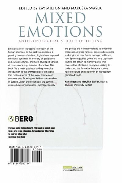 FINALIntroduction: Emotions in anthropologyMaruska Svasek Queen's University BelfastChapter 1: Meaning feeling and human ecologyKay Milton Queen's Universiy BelfastChapter 2: Darwin on the expression of the emotions: the eclipse of a research programmePeter Bowler Queen's University BelfastChapter 3: Being there: emotion and imagination in anthropologists' encountersElizabeth Tonkin Professor Emerita Queen's University BelfastChapter 4: Resentment as a sense of selfLisette Josephides Queen's University BelfastChapter 5: Emotion memory and religious rituals: an assessment of two theoriesHarvey Whitehouse Queen's University BelfastChapter 6: When intuitive knowledge fails: emotion art and resolutionPaul Sant Cassia University of DurhamChapter 7: 'Catholics Protestants and office workers from the town': the experience and negotiation of fear in Northern IrelandKaren D. Lysaght Dublin Institute of TechnologyChapter 8: 'As if someone dear to me had died': intimate landscapes political subjectivity and the problem of a park in SardiniaTracey Heatherington University of Wisconsin USAChapter 9: Love suffering and grief among Spanish Gitanos Paloma Gay y Blasco University of St AndrewsChapter 10: Maternal feelings on monkey mountain: cross-species emotional affinity in JapanJohn Knight Queen's University BelfastChapter 11: The politics of chosen trauma: expellee memories emotions and identitiesMaruska Svasek Queen's University BelfastAfterwordKay Milton Queen's University Belfast
