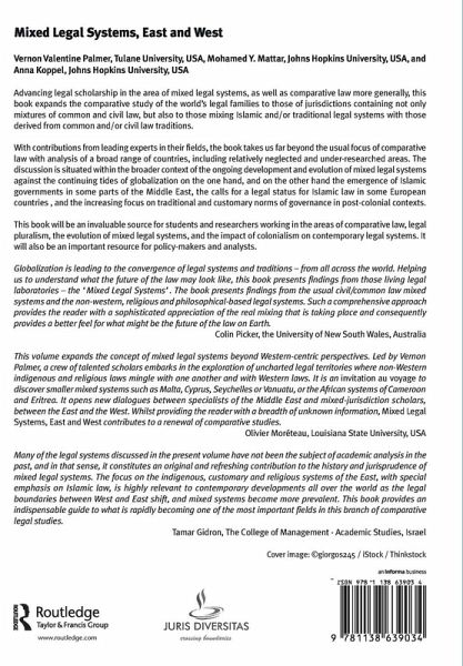 Part I: The Contemporary Nature of Mixed Legal Systems; Chapter 1: "As Slippery as an Eel"? Comparative Law and Polyjural Systems; Chapter 2: To Hybridity and Beyond: Reflections on Legal and Normative Complexity; Chapter 3: Mixed Jurisdictions: The Roads Ahead; Part II: Patterns of Common and Civil Law Hybridities; Chapter 4: Do Pronouncements of the Constitutional Court Bind Erga Omnes? The Common Law Doctrine of Stare Decisis versus the Civil Law Doctrine of Nonbinding Case Law within a Maltese Law Context; Chapter 5: The Parts That Make a Whole? The Mixity of the Laws of Seychelles; Chapter 6: Reconstructing Mixity: Sources of Law and Legal Method in Cyprus; Chapter 7: Managing Legal Diversity: Cameroonian Bijuralism at a Critical Crossroads; Part III: Mixed Legal Systems with Indigenous, Customary, and Religious Law; Chapter 8: Pacific Punch: Tropical Flavors of Mixedness in the Island Republic of Vanuatu; Chapter 9: "I'm in the East, but My Law Is from the West": The East-West Dilemma in the Israeli Mixed Legal System; Chapter 10: Patterns of Legal Mixing in Eritrea: Examining the Impact of Customary Law, Islamic Law, Colonial Law, Socialist Law, and Authoritarian Revolutionary Dogma; Chapter 11: The Influence of Philippine Indigenous Law on the Development of New Concepts of Social Justice; Part IV: The Islamic Legal System and Western Legal Traditions; Chapter 12: Turkey's Synthetic Civilian Tradition in a "Covert" Mix with Islam as Tradition: A Novel Hybrid?; Chapter 13: Integration of Islamic Law in the Fabric of Legal Thought in Egypt; Chapter 14: The Influence of Religion on Law in the Iranian Legal System; Chapter 15: The Reception of Islamic Law in Sri Lanka and Its Interplay with Western Legal Traditions; Chapter 16: The Contribution of the Courts in the Integration of Muslim Law into the Mixed Fabric of South African Law; Part V: Patterns of Mixing in Specialized Areas of the Law; Chapter 17: Islamic Law and International Law in the Islamic Republic of Iran's Constitution; Chapter 18: A Study of the Consolidation of Islamic Law and Modern Western Law in the Iranian Penal Code; Chapter 19: The Ancient Euro-Mediterranean Aversion for Usury; Chapter 20: Settling Islamic Finance Disputes: The Case of Malaysia and Saudi Arabia; Chapter 21: Mixed Legal Jurisdictions and Clinical Legal Education: Latest Trends