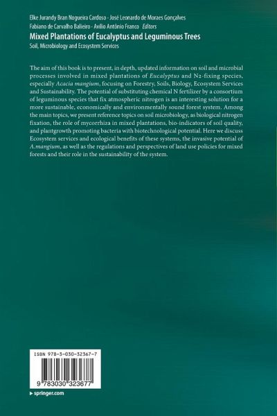 The aim of this book is to present, in depth, updated information on soil and microbial processes involved in mixed plantations of Eucalyptus and N2-fixing species, especially Acacia mangium, focusing on Forestry, Soils, Biology, Ecosystem Services and Sustainability. The potential of substituting chemical N fertilizer by a consortium of leguminous species that fix atmospheric nitrogen is an interesting solution for a more sustainable, economically and environmentally sound forest system. Among the main topics, we present reference topics on soil microbiology, as biological nitrogen fixation, the role of mycorrhiza in mixed plantations, bio-indicators of soil quality, and plantgrowth promoting bacteria with biotechnological potential. Here we discuss Ecosystem services and ecological benefits of these systems, the invasive potential of A.mangium, as well as the regulations and perspectives of land use policies for mixed forests and their role in the sustainability of the system.