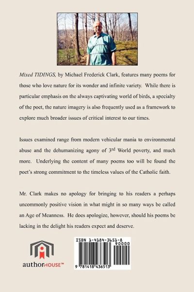 Mixed TIDINGS is a volume of poems for those who have a love for nature in its wonder and infinite variety and its widely different and fascinating moods. While there is particular emphasis on the always captivating world of birds, a specialty of the poet, Michael Frederick Clark, the nature imagery in general is frequently used as a framework to explore much broader themes, including social commentary and criticism on many levels of current interest. Prominent in or underlying the content of many poems too will be found Mr. Clark's pronounced commitment to the timeless values of the Catholic faith. It is the poet's sincere hope that the diversity of formats and "voices" experienced in these poems will appreciably add to the reader's enjoyment.