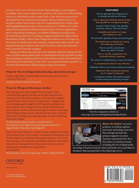 Mixing and mastering, the two final steps in the complex process of sound engineering, require both artistic finesse and technical facility. Even the slightest difference in the way a sound is processed can lead to a shift in the overall aesthetic of a piece, and so sound engineers must work towards an understanding of sound engineering that is particularly oriented towards the artistic and aesthetic. In order to create effective mixes, a sound engineer must maintain a distinct set of artistic goals while drawing on an in-depth understanding of the software involved in the process. Creating final masters requires specialized aural skills and a similarly advanced understanding of the software in order to fine-tune the product with respect to these goals. Mixing and Mastering in the Box addresses the practical and technological necessities of these two final steps without neglecting the creative process that is integral to the creation of high-quality recordings. Savage focuses primarily on creating mixes and masters in the Digital Audio Workstation (DAW), or "in the box," currently a popular platform in the field of sound engineering due to the creative advantages and advanced technological capabilities it offers to its users. However, much of the information presented in Mixing and Mastering in the Box is also applicable to analog mixing gear or a hybrid system of digital and analog tools. This book, which features over one hundred illustrations and a comprehensive companion website, is ideal for beginning or intermediate students in sound engineering with a focus on DAW, recording artists who do their own mixing and mastering, or musicians who wish to be better informed when collaborating on mixes and masters.