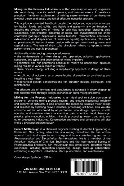 This book is written primarily for an audience of engineers who design, specify, procure, update, and maintain mixers in the processing industries. It is an ap plication-oriented handbook to support the design and operation of mixers for liquids, liquids and solids, liquids and gases, and any combination thereof. This book does not address solids mixing. Mixing applications are identified as either flow controlling or shear rate controlling, and are addressed as such. Specific mixing applications and design parameters are presented for blending, solid suspension, heat transfer, mass transfer, dispersions, extractions, etc. Fundamentals of mixer design and operation, agitation applications spec trum, types and geometries of mixing impellers, etc. are presented in Chapter I, providing the basis for practical information presented in subsequent chap ters. Flow controlled mixing applications are discussed in Chapter 2. These in clude blending, solid suspension, heat transfer, dissolving of solids, and crys tallization. Optimization of mixer design is emphasized, with an eye to saving power and capital cost. Also discussed is the use of draft tube circulator mixers to optimize mixer performance and cost. Shear controlled mixing applications are addressed in Chapter 3. These in clude gas-liquid dispersions, mass transfer, fermentation, emulsions, extrac tions, and dispersions of solids in liquids. Chapter 4 focuses on geometric and nongeometric scaleup of mixers to ac complish equal or better mixing results in various scales of volume. Scaleup relevant to applications of blending, solids suspension, and mass and heat trans fer is explained.