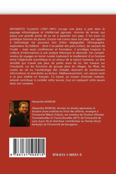 MIYAMOTO Tsunéichi (1907-1981) occupe une place à part dans le paysage ethnologique et intellectuel japonais. Homme de terrain qui passa une grande partie de sa vie à arpenter son pays, il fut aussi un prolifique homme de plume. Encore mal connu dans son pays, son apport à l'ethnologie fut pourtant loin d être négligeable. Ethnographe, explorateur du folklore dont il recueillait des pans entiers, les sauvant de l oubli mais aussi conférencier et formateur, il privilégia toujours la collecte d informations à une analyse théorique et abstraite. Ses compte-rendus de voyages en terres rurales traduisent le tiraillement d un homme entre l objectivité scientifique et un amour de la nature humaine, un être sensible qui n avait pas peur de parler aussi de lui. Ses travaux sur l insularité, sur les fonctions de groupe dans les villages, les fêtes, les routes du sel ou l archéologie des céréales réservent de nombreuses informations et anecdotes au lecteur. Malheureusement, son uvre reste à ce jour inédite en français. Ce travail, au moyen d extraits traduits, entend contribuer à combler cette lacune, tout en replaçant cette uvre dans son contexte.