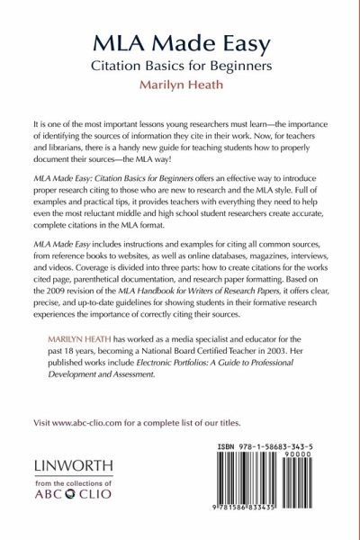 A concise, handy guidebook for teaching correct MLA-style citation to middle and high school researchers. MLA Made Easy: Citation Basics for Beginners offers an effective way to introduce proper research citing to those who are new to research and the MLA style.
