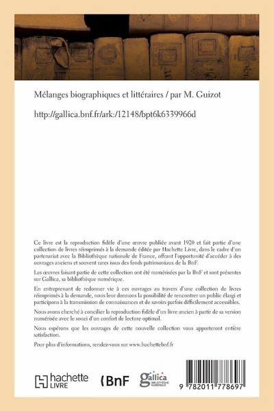 Mélanges biographiques et littéraires / par M. Guizot Date de l'édition originale: 1868 Le présent ouvrage s'inscrit dans une politique de conservation patrimoniale des ouvrages de la littérature Française mise en place avec la BNF. HACHETTE LIVRE et la BNF proposent ainsi un catalogue de titres indisponibles, la BNF ayant numérisé ces oeuvres et HACHETTE LIVRE les imprimant à la demande. Certains de ces ouvrages reflètent des courants de pensée caractéristiques de leur époque, mais qui seraient aujourd'hui jugés condamnables. Ils n'en appartiennent pas moins à l'histoire des idées en France et sont susceptibles de présenter un intérêt scientifique ou historique. Le sens de notre démarche éditoriale consiste ainsi à permettre l'accès à ces oeuvres sans pour autant que nous en cautionnions en aucune façon le contenu. Pour plus d'informations, rendez-vous sur www.hachettebnf.fr