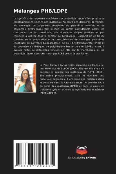 La synthèse de nouveaux matériaux aux propriétés optimisées progresse constamment en science des matériaux. Au cours des dernières décennies, les mélanges de polymères composés de polymères naturels et de polymères synthétiques ont suscité un intérêt considérable parmi les chercheurs car ils constituent une alternative simple, pratique et peu coûteuse à utiliser dans le secteur de l'emballage. L'objectif de ce travail consiste en la préparation et la caractérisation de mélanges polymères constitués de polymère biodégradable, de poly(3-hydroxybutyrate( (PHB) et de polymère synthétique, de polyéthylène basse densité (LDPE), visant à évaluer l'effet de différentes teneurs en PHB sur la morphologie et les propriétés thermiques des mélanges LDPE préparés par fusion.