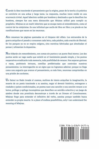 Cuando la idea trasciende el pensamiento que la origina, pasar de la teoría a la práctica se convierte en una ardua y larga tarea. La respuesta, muchas veces reside en una ocurrencia trivial. Aquel laberinto urdido por hombres y destinado a que lo descifren los hombres, siempre fue una mera distracción que Mlejnas utilizó para cumplir su propósito. Mlejnas es un multi-laberinto que se escapa tanto al entendimiento, como al control de los mlejnistas. Es una infinitud que oscila de libro en libro y se pierde en las ramificaciones que nacen en las neuronas. Aún resuenan las páginas quemadas en el tímpano del olfato. Los estruendos de la guerra aniquilan el pasado y consumen cada letra, cada palabra, cada oración de libertad. En los parques ya no se respira oxígeno, sino mentiras fabricadas que almohadan el pensar y alimentan la dopamina. Nos tildarán sin remordimiento, con comas sin puntos y un punto final eterno. Los dos puntos serán un vago sueño que existió en el inexistente pasado simple, y los puntos suspensivos erradicarán toda memoria, toda posibilidad de renacer. Nos separan guiones y rayas, paréntesis intrusos, comillas prefabricadas que controlan nuestros pensamientos. La interrogación es un signo que no logramos admirar; porque no llega como una angustia que avance el pensamiento, es más bien, neuronas comprimidas en una prisión de corchetes. Un Satsui no Hado invade el cosmos, molinos de viento aniquilan la imaginación, la muerte de un poeta trasciende a su asesina, negar el devenir histórico, entregarse a ciudades y países condicionados, un poema nace una canción y una canción renace a un lector, prólogo y epílogo incompletos que describen un suicidio colectivo y un juego de ajedrez donde una prostituta deconstruye a través de un Stream of Consciousness. Mlejnas finge para entender el infinitivo del verbo, asesina porque también busca entender su propia muerte. In a place of endless possibilities, only I can understand the meaning of Mlejnas.