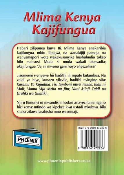 Habari ziliponea kuwa Bi. Mlima Kenya anakaribia kujifungua, mbiu ilipigwa, na wanakijiji pamoja na wanyamapori wote wakakusanyika kushuhudia tokeo hilo mahsusi. Muda si muda wakati ukawadia; akajifungua. "Je, ni mwana gani huyo aliyezaliwa? Jisomeeni wenyewe hii hadithi ili mpate kutambua. Na zaidi ya hiyo, kunazo vilevile, hadithi nyingine sita: Karamu Ya Kujialika; Fisi tumboni mwa Tembo, Bidii ni Mali; Mama Mja Mzito na Jitu; Nani Mlaji Zaidi na Urafiki wa Unafiki.