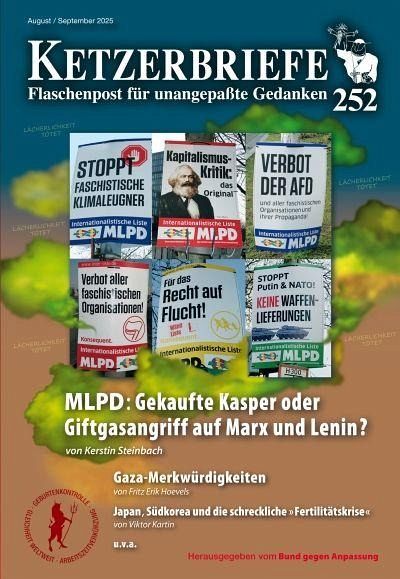 InhaltMLPD: Gekaufte Kasper oder Giftgasangriff auf Marx und Lenin?von Kerstin SteinbachGedanken zur Berliner »Großdemonstration« - Unerfahrenheit oder Fehlleitung zwecks Demoralisierung?von Beate SkaléeGaza-Merkwürdigkeitenvon Fritz Erik HoevelsJapan, Südkorea und die schreckliche »Fertilitätskrise«von Viktor KartinTrump ist in die Falle gegangen - die Völker der Welt verlieren ihren letzten BeschützerZwischenbericht zum Prozeß gegen Michael Ballwegvon Eva SalernoZensur unerwünschter Bücher in öffentlichen BibliothekenZwei Bücher zur CORONA-»Aufarbeitung«von Nadja BaderDas Retorten-Virus im Krieg gegen Chinavon Viktor KartinRezension: Tobias Lehmkuhl. Der doppelte Erichvon Fritz Erik HoevelsAHRIMAN gratuliert COMPACT zum letztinstanzlichen Erfolg im Verbotsverfahren!