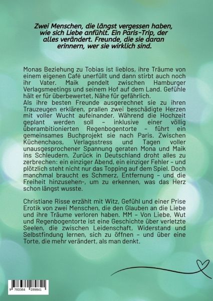 Monas Beziehung zu Tobias ist lieblos, ihre Träume von einem eigenen Café unerfüllt und dann stirbt auch noch ihr Vater. Maik pendelt zwischen Hamburger Verlagsmeetings und seinem Hof auf dem Land. Gefühle hält er für überbewertet, Nähe für gefährlich. Als ihre besten Freunde ausgerechnet sie zu ihren Trauzeugen erklären, prallen zwei beschädigte Herzen mit voller Wucht aufeinander. Während die Hochzeit geplant werden soll - inklusive einer völlig überambitionierten Regenbogentorte - führt ein gemeinsames Buchprojekt sie nach Paris. Zwischen Küchenchaos, Verlagsstress und Tagen voller unausgesprochener Spannung geraten Mona und Maik ins Schleudern. Zurück in Deutschland droht alles zu zerbrechen: ein einziger Abend, ein einziger Fehler - und plötzlich steht nicht nur das Topping auf dem Spiel. Doch manchmal braucht es Schmerz, Entfernung - und die Freiheit hinzusehen-, um zu erkennen, was das Herz schon längst wusste. Christiane Risse erzählt mit Witz, Gefühl und einer Prise Erotik von zwei Menschen, die den Glauben an die Liebe und ihre Träume verloren haben. MM - Von Liebe, Wut und Regenbogentorte ist eine Geschichte über verletzte Seelen, die zwischen Leidenschaft, Widerstand und Selbstfindung lernen, sich zu öffnen - und über eine Torte, die mehr verändert, als man denkt.
