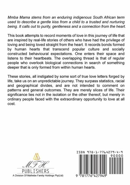 Mmba Mama stems from an enduring indigenous South African term used to describe a gentle kiss from a child to a trusted and nurturing being. It calls out to purity, gentleness and a connection from the heart. This book attempts to record moments of love in this journey of life that are inspired by real-life stories of others who have had the privilege of loving and being loved straight from the heart. It records bonds formed by human hearts that transcend popular culture and socially constructed behavioural expectations. One enters their space and listens to their heartbeats. The overlapping thread is that of regular people who overlook biological connections in search of something deeper that is only formed from within human hearts. These stories - all instigated by some sort of true love letters forged by life - take us on an unpredictable journey. They surpass statistics, racial and geographical divides, and are not intended to comment on patterns and general outcomes. They are merely slices of life. Their significance lies not in the isolation or the other thereof, but merely in ordinary people faced with the extraordinary opportunity to love at all cost.