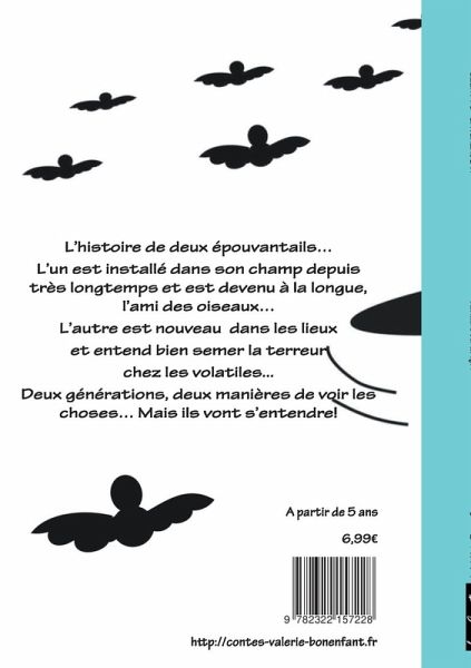Entrez dans ce livre et découvrez les aventures de deux épouvantails...L'un est installé dans son champ depuis longtemps et est devenu à la longue, l'ami des oiseaux. L'autre est nouveau dans les lieux et entend bien semer la terreur chez les volatiles.Deux générations, deux manières de voir les choses... Mais ils vont s'entendre!Aux images, Chantal Lauret nous offre des créations pures et esthétiques, en noir et blanc. Des dessins stylisés, où l'essentiel est dit avec peu de chose, tout en émotion. Retrouvez ces personnages sympathiques... des amis qui ne font surtout pas peur !Livre n°25 de la collection "Les contes de Valérie Bonenfant", dont la vocation est :- d'offrir du beau, de la poésie, de la douceur au monde...- de susciter chez le lecteur, jeune et moins jeune, l'imaginaire, le rêve, l'émotion...- de porter l'expression libre d'artistes de tous horizons : illustrateurs, graphistes, peintres, artistes urbains, mais aussi photographes, designers, architectes...Chaque livre est une pièce unique, porteuse d'art, de créativité, d'authenticité. Léger, il s'emmène facilement avec soi, mais est aussi digne de siéger en bibliothèque.- Format A5, 32 pages, illustrations couleur.- Public : tout âge, à partir de 5 ans.- Site internet : http://contes-valerie-bonenfant.fr