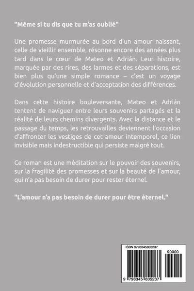 "Même si tu dis que tu m'as oublié" est une exploration poignante de l'amour, du temps, et des promesses que l'on fait en croyant qu'elles dureront pour toujours. Mateo et Adrián se sont rencontrés dans leur jeunesse, leurs coeurs remplis de rêves et de certitudes. Leur amour était sincère, et ils s'étaient promis de vieillir ensemble, convaincus que rien ne pourrait ébranler ce lien unique qui les unissait. Mais la vie, avec ses chemins imprévus et ses épreuves, les a séparés, laissant derrière elle une promesse brisée et un amour suspendu dans le passé. Des années après leur séparation douloureuse, chacun a tenté de tourner la page à sa manière. Mateo s'est lancé dans une carrière discrète mais impressionnante, se concentrant sur les affaires et la durabilité, trouvant un sens profond dans un succès sans ostentation. Adrián, quant à lui, a cherché à se réinventer, poursuivant un besoin d'approbation et de validation à travers les réseaux sociaux, là où les regards admiratifs compensent peut-être les blessures invisibles. Mais, malgré leurs vies bien établies, un fil invisible les relie encore. À travers des souvenirs partagés sur les réseaux sociaux et des moments de nostalgie, ils se retrouvent indirectement, chacun se demandant ce qu'il reste de cet amour ancien. Finalement, une rencontre imprévue les oblige à faire face à la réalité ils ne sont plus les mêmes, et la promesse de vieillir ensemble appartient à une autre époque. Dans ce roman émouvant, Thom Ramus nous invite à réfléchir sur la force des souvenirs et sur l'amour qui perdure, même lorsque tout semble perdu. "L'amour n'a pas besoin de durer pour être éternel." Ces mots résonnent tout au long du livre, car parfois, certains amours ne s'effacent jamais vraiment, même lorsque le temps, les blessures, et la distance ont tout transformé. "Même si tu dis que tu m'as oublié" est un roman pour tous ceux qui ont aimé profondément et qui, malgré les séparations et les années, continuent de porter en eux la marque indélébile d'un amour qui les a changés. Ce livre parle de la résilience, de la nostalgie et de l'acceptation des chemins différents que la vie peut nous imposer, tout en honorant la beauté d'un amour qui, bien que passé, reste gravé pour toujours.