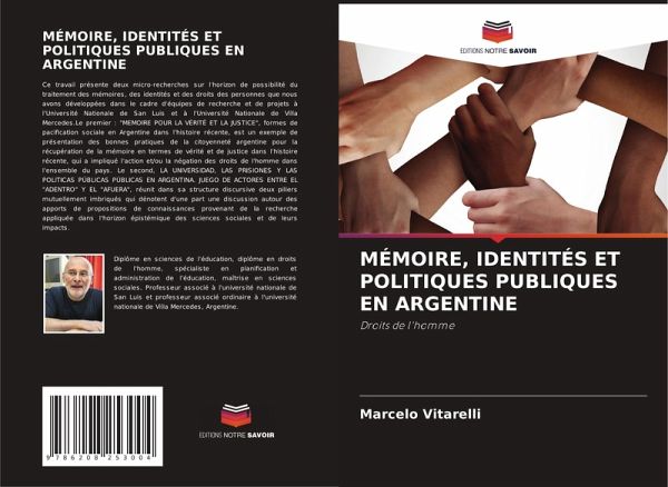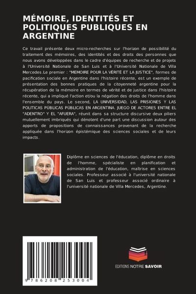 Ce travail présente deux micro-recherches sur l'horizon de possibilité du traitement des mémoires, des identités et des droits des personnes que nous avons développées dans le cadre d'équipes de recherche et de projets à l'Université Nationale de San Luis et à l'Université Nationale de Villa Mercedes.Le premier : "MEMOIRE POUR LA VÉRITÉ ET LA JUSTICE", formes de pacification sociale en Argentine dans l'histoire récente, est un exemple de présentation des bonnes pratiques de la citoyenneté argentine pour la récupération de la mémoire en termes de vérité et de justice dans l'histoire récente, qui a impliqué l'action et/ou la négation des droits de l'homme dans l'ensemble du pays. Le second, LA UNIVERSIDAD, LAS PRISIONES Y LAS POLITICAS PÚBLICAS PÚBLICAS EN ARGENTINA. JUEGO DE ACTORES ENTRE EL "ADENTRO" Y EL "AFUERA", réunit dans sa structure discursive deux piliers mutuellement imbriqués qui dénotent d'une part une discussion autour des apports de propositions de connaissances provenant de la recherche appliquée dans l'horizon épistémique des sciences sociales et de leurs impacts.