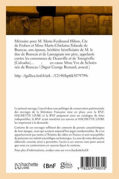 Mémoire pour M. Marie-Ferdinand Hibon, Cte de Frohen et Mme Marie-Ghislaine-Yolande de Brancas, son épouse, héritière bénéficiaire de M. le duc de Brancas et de Lauraguais son père, appelants contre les communes de Deauville et de Tourgéville [Calvados]...; en cause Mme Vve de Schoën née de Brancas / [Signé George Besnard, avocat.] Date de l'édition originale: 1855 Le présent ouvrage s'inscrit dans une politique de conservation patrimoniale des ouvrages de la littérature Française mise en place avec la BNF. HACHETTE LIVRE et la BNF proposent ainsi un catalogue de titres indisponibles, la BNF ayant numérisé ces oeuvres et HACHETTE LIVRE les imprimant à la demande. Certains de ces ouvrages reflètent des courants de pensée caractéristiques de leur époque, mais qui seraient aujourd'hui jugés condamnables. Ils n'en appartiennent pas moins à l'histoire des idées en France et sont susceptibles de présenter un intérêt scientifique ou historique. Le sens de notre démarche éditoriale consiste ainsi à permettre l'accès à ces oeuvres sans pour autant que nous en cautionnions en aucune façon le contenu. Pour plus d'informations, rendez-vous sur www.hachettebnf.fr