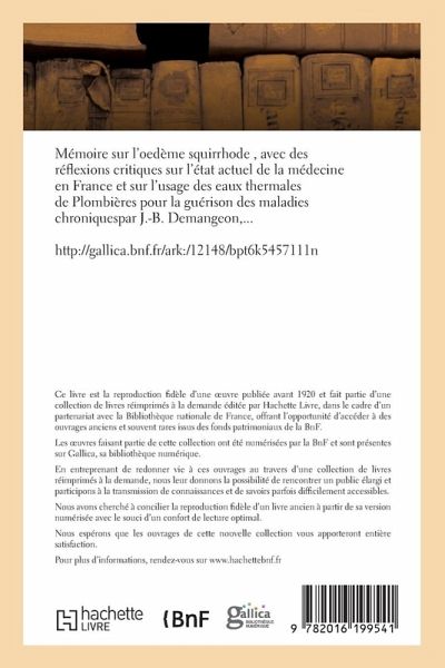 Mémoire sur l'oedème squirrhode, avec des réflexions critiques sur l'état actuel de la médecine en France et sur l'usage des eaux thermales de Plombières pour la guérison des maladies chroniquespar J.-B. Demangeon, ... Date de l'édition originale: 1830 Le présent ouvrage s'inscrit dans une politique de conservation patrimoniale des ouvrages de la littérature Française mise en place avec la BNF. HACHETTE LIVRE et la BNF proposent ainsi un catalogue de titres indisponibles, la BNF ayant numérisé ces oeuvres et HACHETTE LIVRE les imprimant à la demande. Certains de ces ouvrages reflètent des courants de pensée caractéristiques de leur époque, mais qui seraient aujourd'hui jugés condamnables. Ils n'en appartiennent pas moins à l'histoire des idées en France et sont susceptibles de présenter un intérêt scientifique ou historique. Le sens de notre démarche éditoriale consiste ainsi à permettre l'accès à ces oeuvres sans pour autant que nous en cautionnions en aucune façon le contenu. Pour plus d'informations, rendez-vous sur www.hachettebnf.fr