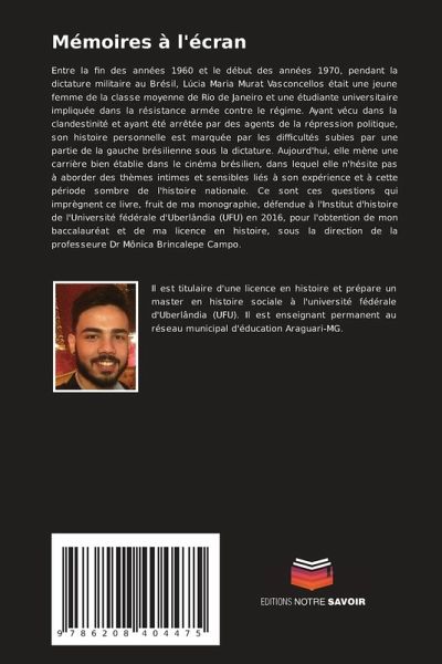 Entre la fin des années 1960 et le début des années 1970, pendant la dictature militaire au Brésil, Lúcia Maria Murat Vasconcellos était une jeune femme de la classe moyenne de Rio de Janeiro et une étudiante universitaire impliquée dans la résistance armée contre le régime. Ayant vécu dans la clandestinité et ayant été arrêtée par des agents de la répression politique, son histoire personnelle est marquée par les difficultés subies par une partie de la gauche brésilienne sous la dictature. Aujourd'hui, elle mène une carrière bien établie dans le cinéma brésilien, dans lequel elle n'hésite pas à aborder des thèmes intimes et sensibles liés à son expérience et à cette période sombre de l'histoire nationale. Ce sont ces questions qui imprègnent ce livre, fruit de ma monographie, défendue à l'Institut d'histoire de l'Université fédérale d'Uberlândia (UFU) en 2016, pour l'obtention de mon baccalauréat et de ma licence en histoire, sous la direction de la professeure Dr Mônica Brincalepe Campo.