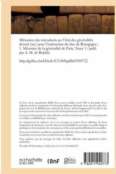 Mémoires des intendants sur l'état des généralités dressés [sic] pour l'instruction du duc de Bourgogne; 1. Mémoire de la généralité de Paris. Tome 1 / publ. par A. M. de Boislile Date de l'édition originale: 1881 Sujet de l'ouvrage: France. Intendance (Paris) -- Histoire -- Sources Collection: Collection de documents inédits sur l'histoire de France Le présent ouvrage s'inscrit dans une politique de conservation patrimoniale des ouvrages de la littérature Française mise en place avec la BNF. HACHETTE LIVRE et la BNF proposent ainsi un catalogue de titres indisponibles, la BNF ayant numérisé ces oeuvres et HACHETTE LIVRE les imprimant à la demande. Certains de ces ouvrages reflètent des courants de pensée caractéristiques de leur époque, mais qui seraient aujourd'hui jugés condamnables. Ils n'en appartiennent pas moins à l'histoire des idées en France et sont susceptibles de présenter un intérêt scientifique ou historique. Le sens de notre démarche éditoriale consiste ainsi à permettre l'accès à ces oeuvres sans pour autant que nous en cautionnions en aucune façon le contenu. Pour plus d'informations, rendez-vous sur www.hachettebnf.fr