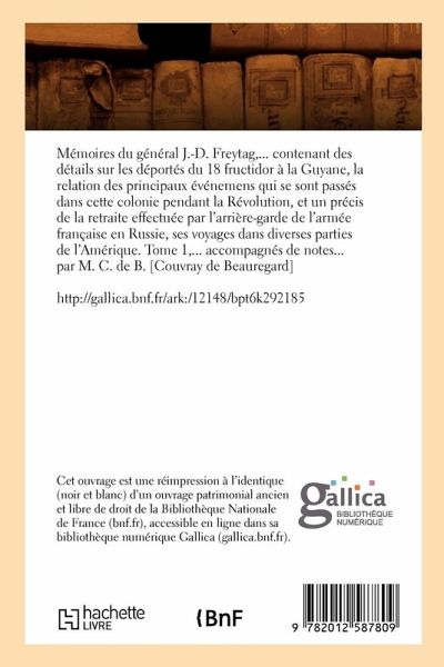 Memoires du general J.-D. Freytag,... contenant des details sur les deportes du 18 fructidor a la Guyane, la relation des principaux evenemens qui se sont passes dans cette colonie pendant la Revolution, et un precis de la retraite effectuee par l'arriere-garde de l'armee francaise en Russie, ses voyages dans diverses parties de l'Amerique. Tome 1 / ,... accompagnes de notes... par M. C. de B. [Couvray de Beauregard]Date de l'edition originale : 1824Ce livre est la reproduction fidele d'une oeuvre publiee avant 1920 et fait partie d'une collection de livres reimprimes a la demande editee par Hachette Livre, dans le cadre d'un partenariat avec la Bibliotheque nationale de France, offrant l'opportunite d'acceder a des ouvrages anciens et souvent rares issus des fonds patrimoniaux de la BnF.Les oeuvres faisant partie de cette collection ont ete numerisees par la BnF et sont presentes sur Gallica, sa bibliotheque numerique.En entreprenant de redonner vie a ces ouvrages au travers d'une collection de livres reimprimes a la demande, nous leur donnons la possibilite de rencontrer un public elargi et participons a la transmission de connaissances et de savoirs parfois difficilement accessibles.Nous avons cherche a concilier la reproduction fidele d'un livre ancien a partir de sa version numerisee avec le souci d'un confort de lecture optimal. Nous esperons que les ouvrages de cette nouvelle collection vous apporteront entiere satisfaction.Pour plus d'informations, rendez-vous sur www.hachettebnf.frhttp://gallica.bnf.fr/ark:/12148/bpt6k292185