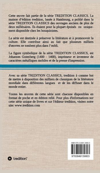 Cette uvre (édition relié) fait partie de la série TREDITION CLASSICS. La maison d édition tredition, basée à Hambourg, a publié dans la série TREDITION CLASSICS des ouvrages anciens de plus de deux millénaires. Ils étaient pour la plupart épuisés ou uniquement disponible chez les bouquinistes. La série est destinée à préserver la littérature et à promouvoir la culture. Avec sa série TREDITION CLASSICS, tredition à comme but de mettre à disposition des milliers de classiques de la littérature mondiale dans différentes langues et de les diffuser dans le monde entier.