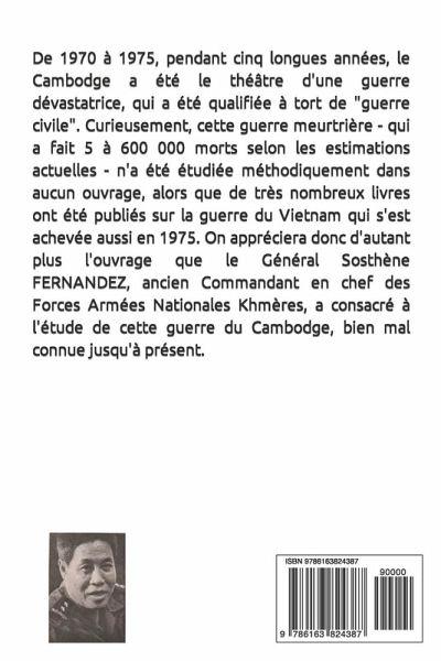 De 1970 à 1975, pendant cinq longues années, le Cambodge a été le théâtre d'une guerre dévastatrice, qui a été qualifiée à tort de "guerre civile". Curieusement, cette guerre meurtrière - qui a fait 5 à 600 000 morts selon les estimations actuelles - n'a été étudiée méthodiquement dans aucun ouvrage, alors que de très nombreux livres ont été publiés sur la guerre du Vietnam qui s'est achevée aussi en 1975. On appréciera donc d'autant plus l'ouvrage que le Général Sosthène FERNANDEZ, ancien Commandant en chef des Forces Armées Nationales Khmères, a consacré à l'étude de cette guerre du Cambodge, bien mal connue jusqu'à présent.