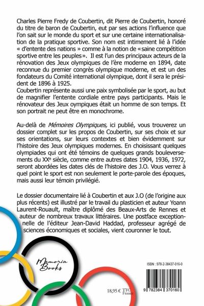 Un livre complet sur les JO ! Le texte mythique et fondateur de Coubertin, mais aussi un superbe dossier documentaire lié à Coubertin et aux JO. (de l¿origine aux plus récents) illustré par le travail du plasticien et auteur Yoann Laurent-Rouault, maître diplômé des Beaux-Arts de Rennes et auteur de nombreux travaux littéraires. Une postface exceptionnelle de l¿éditeur Jean-David Haddad, professeur agrégé de sciences économiques et sociales, vient couronner le tout en abordant les aspects économiques et sociétaux des JO. Charles Pierre Fredy de Coubertin, dit Pierre de Coubertin, honoré du titre de baron de Coubertin, eut par ses actions l¿influence que l¿on sait sur le monde du sport et sur une certaine internationalisation de la pratique sportive. Son nom est intimement lié à l¿idée «¿d¿entente des nations¿» comme à la notion de «¿saine compétition sportive entre les peuples¿». Il est l¿un des principaux acteurs de la rénovation des Jeux olympiques de l¿ère moderne en 1894, date reconnue du premier congrès olympique moderne, et est un des fondateurs du Comité international olympique, dont il sera le président de 1896 à 1925. Coubertin représente aussi une paix symbolisée par le sport, au but de magnifier l¿entente cordiale entre pays participants. Mais le rénovateur des Jeux olympiques était un homme de son temps. Et son portrait ne peut être en monochrome. Au-delà de « Mémoires Olympiques », ici publié, vous trouverez un dossier complet réalisé et illustré par Yoann Laurent-Rouault, sur les propos de Coubertin, sur ses choix et sur ses orientations, sur leurs contextes et bien évidemment sur l¿histoire des Jeux olympiques modernes. En choisissant quelques olympiades qui ont été témoins de quelques grands bouleversements du XXe siècle, comme entre autres dates 1904, 1936, 1972, seront abordées les dates clés de l¿histoire des JO. Vous verrez à quel point le sport est non seulement le porte-parole des époques, mais aussi leur témoin privilégié.