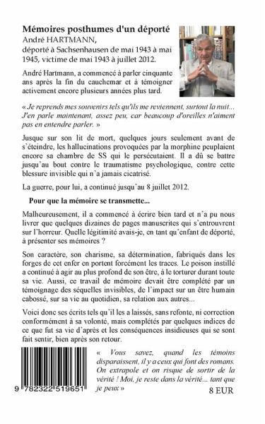 André Hartmann, déporté à Sachsenhausen de mai 1943, a livré tardivement ses mémoires."Pour que la mémoire se transmette", il nous a livré un manuscrit et quelques témoignanges avec une consigne ferme :"Ce que j'écris, l'est d'un trait, au fur et à meure de souvenirs et de mémoire. Donc nulle refonte ni correction ; C'est écrit comme je l'ai vécu (ou survécu !) "Mais le poison instillé au sein de cet enfer a continué à agir au plus profond de son être, à le torturer durant toute sa vie. Aussi, ce travail de mémoire devait être complété par le témoignage des séquelles moins visibles : l'impact sur un être humain cabossé, sur sa vie au quotidien, ses phobies, sa relation aux autres, jusqu'à ses proches.