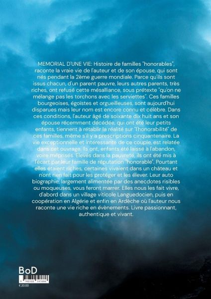 MEMORIAL D'UNE VIE: Histoire de familles "honorables", raconte la vraie vie de l'auteur et de son épouse, qui sont nés pendant la 2ème guerre mondiale. Parce qu'ils sont issus chacun, d'un parent pauvre, leurs autres parents, très riches, ont refusé cette mésalliance, sous prétexte "qu'on ne mélange pas les torchons avec les serviettes". Ces familles bourgeoises, égoïstes et orgueilleuses, sont aujourd'hui disparues mais leur nom est encore connu et célèbre. Dans ces conditions, l'auteur âgé de soixante dix huit ans et son épouse récemment décédée, qui ont été leur petits enfants, tiennent à rétablir la réalité sur "l'honorabilité" de ces familles, même s'il y a prescriptions cinquantenaire. La vie exceptionnelle et intéressante de ce couple, est relatée dans cet ouvrage. Ils ont, enfants été laissé à l'abandon, voire méprisés. Elevés dans la pauvreté, ils ont été mis à l'écart par leur famille de réputation "honorable". Pourtant elles étaient riches, certaines vivaient dans un château et n'ont rien fait pour les protéger et les élever. Leur auto biographie, largement alimentée par des anecdotes risibles ou moqueuses, vous feront marrer. Elles nous les fait vivre, d'abord dans un village viticole Languedocien, puis en coopération en Algérie et enfin en Ardèche où l'auteur nous raconte une vie riche en évènements. Livre passionnant, authentique et vivant.