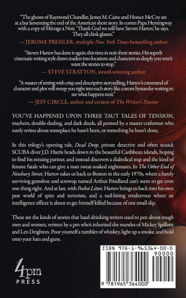 You've happened upon three taut tales of tension, mayhem, double-dealing, and dark deeds, all penned by a master craftsman who rarely writes about someplace he hasn't been, or something he hasn't done. In this trilogy's opening tale, Dead Drop, private detective and often seasick SCUBA diver J.D. Harris heads down to the beautiful Caribbean islands, hoping to find his missing partner, and instead discovers a diabolical trap and the kind of femme fatale who can give a man sweat-soaked nightmares. In The Other End of Newbury Street, Hartov takes us back to Boston in the early 1970s, where a barely surviving gumshoe and screwup named Arthur Friedland can't seem to get even one thing right. And at last, with Pocket Litter, Hartov brings us back into his own past world of spies and terrorists, and a nail-biting rendezvous where an intelligence officer is about to get himself killed because of one small slip. These are the kinds of stories that hard-drinking writers used to pen about rough men and women, written by a pro who's inherited the mantles of Mickey Spillane and Len Deighton. Pour yourself a tumbler of whiskey, light up a smoke, and hold onto your hats and guns. From New York Times bestselling author STEVEN HARTOV (The Last of the Seven, The Soul of a Thief, and In the Company of Heroes) comes this collection of climactic short stories which embody the essence of noir, skillfully crafted for the modern reader. "The ghosts of Raymond Chandler, James M. Caine and Horace McCoy are at a bar lamenting the end of the American short story. In comes Papa Hemingway with a copy of Ménage à Noir. 'Thank God we still have Steven Hartov,' he says. They all clink glasses." - Jerome Preisler, New York Times bestselling author