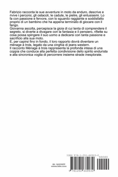 Fabrizio racconta le sue avventure in moto da enduro, descrive e rivive i percorsi, gli ostacoli, le cadute, le pietre, gli entusiasmi. Lo fa con passione e fervore, con lo sguardo raggiante e soddisfatto proprio di un bambino che ha appena terminato di giocare con il fango. Giovanna ascolta, percepisce la gioia di cui tenta di comprendere il segreto, si diverte a divagare con la fantasia e il pensiero, riflette su cosa possa spingere il suo uomo a dedicarsi con tanta passione e sacrificio alla sua moto. E, per capirsi fino in fondo, il loro rapporto dovrà diventare un ménage à trois, legato da una cinghia di jeans western. Il racconto Ménage à trois rappresenta la profonda intesa di una coppia che conduce alla perfetta condivisione dello spirito endurista e alla sincronica voglia di percorrere insieme strade inesplorate.