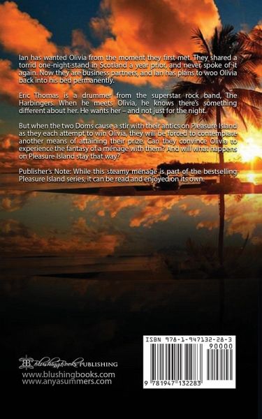 Ian has wanted Olivia from the moment they first met. They shared a torrid one-night-stand in Scotland a year prior, and never spoke of it again. Now they are business partners, and Ian has plans to woo Olivia back into his bed permanently. Eric Thomas is a drummer from the superstar rock band, The Harbingers. When he meets Olivia, he knows there’s something different about her. He wants her – and not just for the night. But when the two Doms cause a stir with their antics on Pleasure Island as they each attempt to win Olivia, they will be forced to contemplate another means of attaining their prize. Can they convince Olivia to experience the fantasy of a ménage with them? And will what happens on Pleasure Island stay that way?
