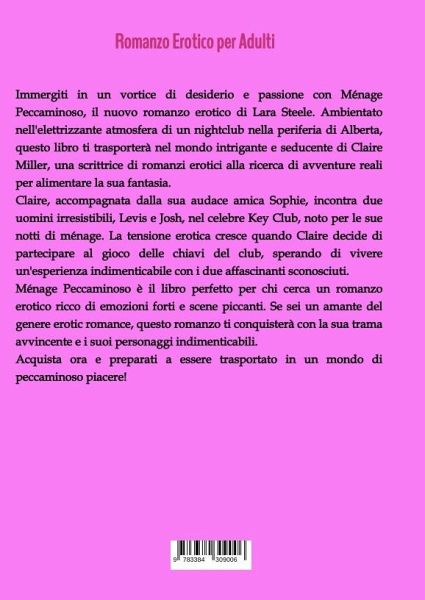 Immergiti in un vortice di desiderio e passione con Ménage Peccaminoso, il nuovo romanzo erotico di Lara Steele. Ambientato nell'elettrizzante atmosfera di un nightclub nella periferia di Alberta, questo libro ti trasporterà nel mondo intrigante e seducente di Claire Miller, una scrittrice di romanzi erotici alla ricerca di avventure reali per alimentare la sua fantasia.Claire, accompagnata dalla sua audace amica Sophie, incontra due uomini irresistibili, Levis e Josh, nel celebre Key Club, noto per le sue notti di ménage. La tensione erotica cresce quando Claire decide di partecipare al gioco delle chiavi del club, sperando di vivere un'esperienza indimenticabile con i due affascinanti sconosciuti.Ménage Peccaminoso è il libro perfetto per chi cerca un romanzo erotico ricco di emozioni forti e scene piccanti. Se sei un amante del genere erotic romance, questo romanzo ti conquisterà con la sua trama avvincente e i suoi personaggi indimenticabili.Acquista ora e preparati a essere trasportato in un mondo di peccaminoso piacere!