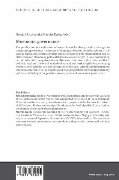 The publication is a collection of research articles that provide an insight to mnemonic governance - a process of shaping the shared social imaginary of the past by legislators, courts, scholars and other actors. This phenomenon can be observed as an element of political discourse or as changes in law consolidating certain officially recognized states. The contributions in this volume offer a political, legal and historical analysis of transitional justice legislation, emerging memory laws, and the societal perception of the past. With this publication, we intend to contribute to the ongoing and changing debate surrounding memory politics and highlight the practical consequences of mnemonic governance.