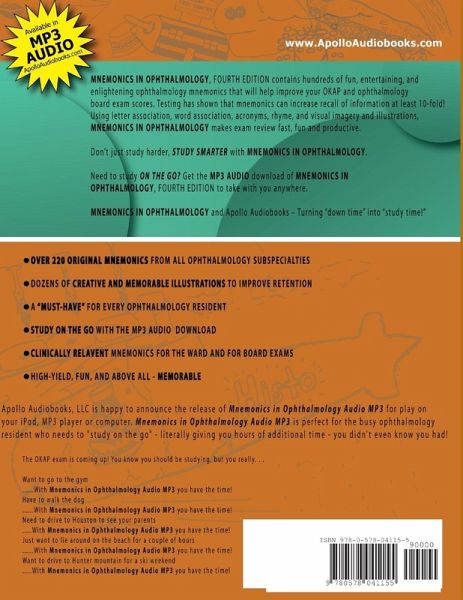 Mnemonics in Ophthalmology is a COLLECTION OF OVER 440 OPHTHALMOLOGY MNEMONICS! More than 220 of the ophthalmology mnemonics are completely original and available only in this book. OTHER FEATURES: dozens of fun and memorable original illustrations; a comprehensive index; and available in MP3 AUDIO for MP3 player or iPod. A "MUST HAVE" FOR EVERY OPHTHALMOLOGY RESIDENT. Mnemonics in Ophthalmology (published as notes for years by Dr. Ing) has helped tons of ophthalmology residents with their OKAP exams and ophthalmology board exams and rotations. Whether looking for answers on rounds or on ophthalmology exams, Mnemonics in Ophthalmology is here to help. SPECIALTY SECTIONS: Retina, Strabismus, Pediatrics, Uveitis, Neuro-Ophthalmology, Oculoplastics, and MANY MORE... FOR THE OPHTHALMOLOGY BOARD EXAMS - see the "Suggestions for Multiple Choice and Oral Exams" sections. Take the MP3 AUDIO version with you and - STUDY ON-THE-GO! www.ApolloAudiobooks.com