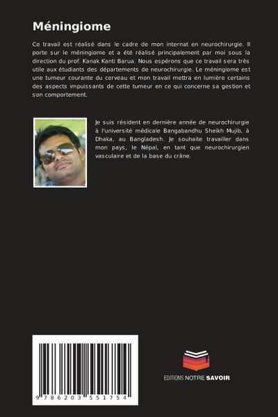 Ce travail est réalisé dans le cadre de mon internat en neurochirurgie. Il porte sur le méningiome et a été réalisé principalement par moi sous la direction du prof. Kanak Kanti Barua. Nous espérons que ce travail sera très utile aux étudiants des départements de neurochirurgie. Le méningiome est une tumeur courante du cerveau et mon travail mettra en lumière certains des aspects impuissants de cette tumeur en ce qui concerne sa gestion et son comportement.