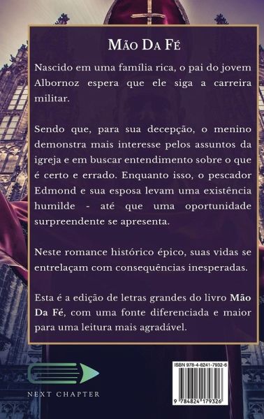 Nascido em uma família rica, o pai do jovem Albornoz espera que ele siga a carreira militar. Sendo que, para sua decepção, o menino demonstra mais interesse pelos assuntos da igreja e em buscar entendimento sobre o que é certo e errado. Enquanto isso, o pescador Edmond e sua esposa levam uma existência humilde - até que uma oportunidade surpreendente se apresenta. Neste romance histórico épico, suas vidas se entrelaçam com consequências inesperadas. Esta é a edição de letras grandes do livro Mão Da Fé, com uma fonte diferenciada e maior para uma leitura mais agradável.